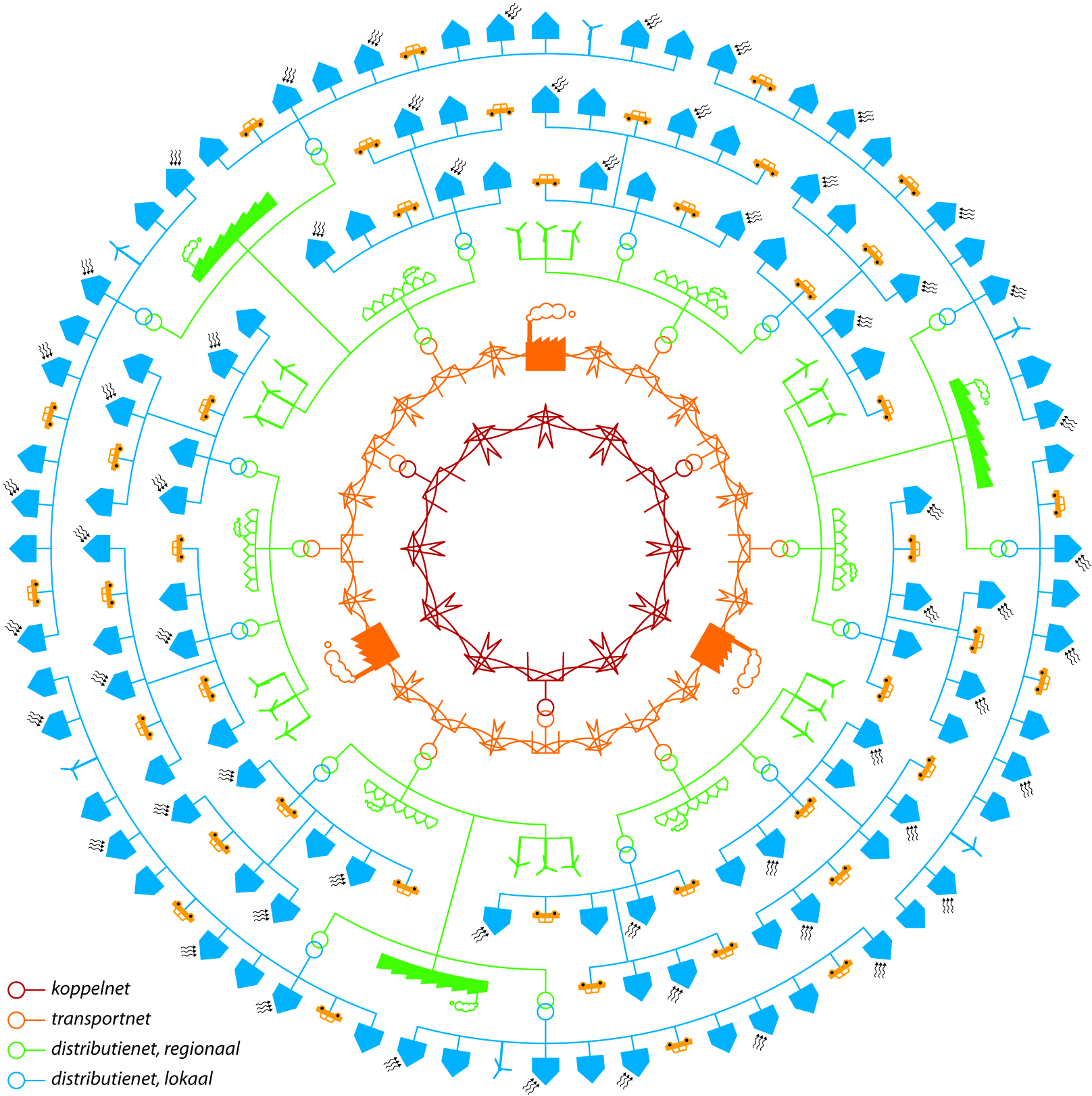 De regionale distributienetten zijn in dit figuur afgebeeld met de derde ring. Deze netten worden gevoed vanuit de transportnetten. Op deze netten zijn ook grote decentrale opwekkers (warmtekrachtcentrales en windturbines) en grote industriële klanten met vermogens van 0,3 tot ongeveer 10 MVA aangesloten. In de regio’s voeden de distributienetten de lokale distributienetten. Het totale vermogen van een regionaal distributienet ligt in de orde van 100 MVA.