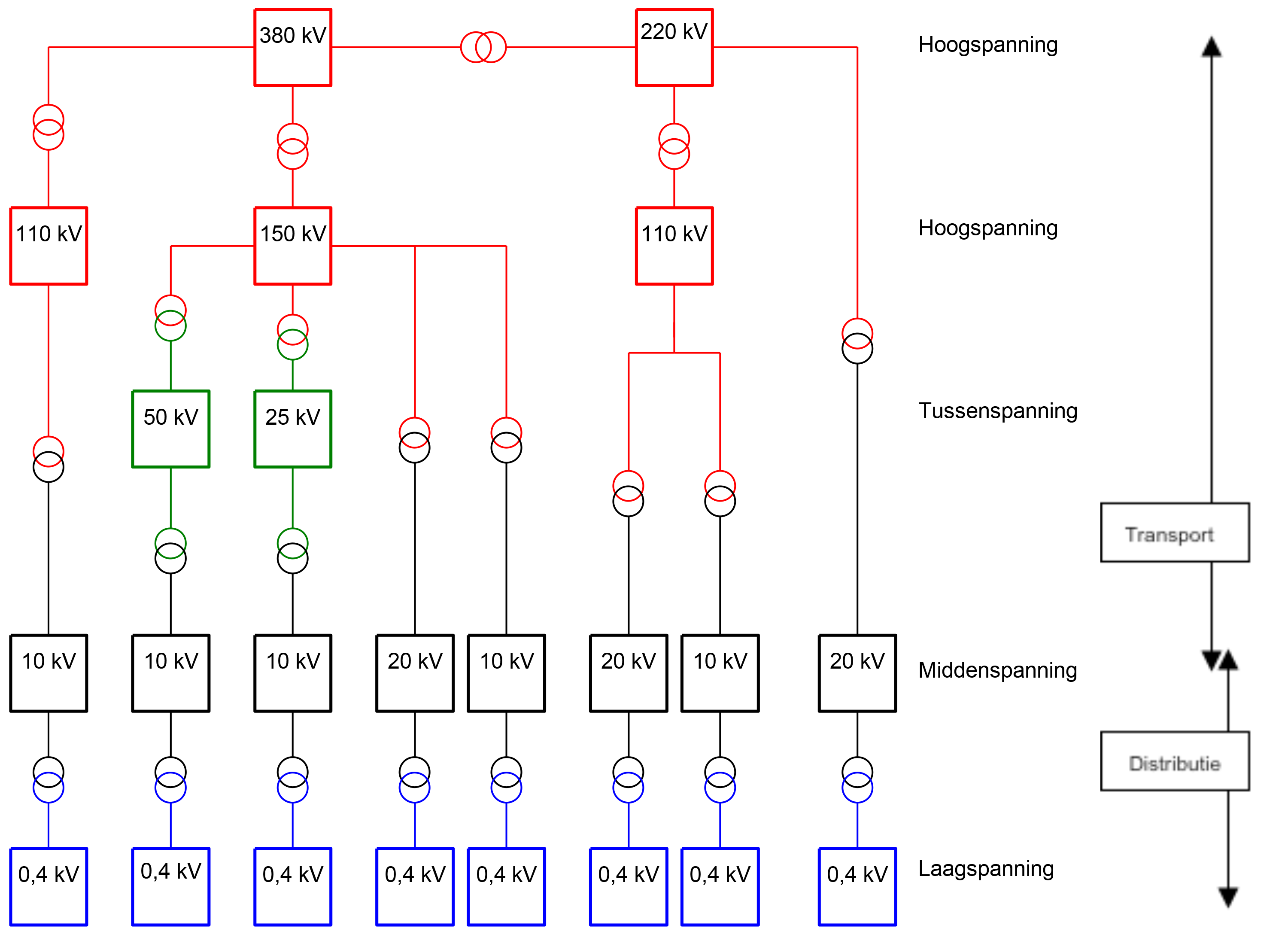 De functie heeft een relatie met het spanningsniveau, omdat bij een hoog spanningsniveau een groter vermogen getransporteerd kan worden dan bij een laag spanningsniveau. Als gevolg hebben de hoogspanningsnetten altijd een transportfunctie en de laagspanningsnetten altijd een distributiefunctie. Bovendien is het laagspanningsniveau praktisch en veilig voor het aansluiten van de installaties van de klanten. Tussen de hoog- en laagspanningsniveaus is een overgangsgebied van de transport- naar de distributiefunctie. Het overgangsgebied betreft het middenspanningsniveau. De middenspanningsnetten hebben meestal een distributiefunctie, maar hebben soms ook een transportfunctie. Ondanks deze onduidelijkheid worden de elektriciteitsnetten meestal aangeduid met hun spanningsniveau. Figuur 2.2 geeft een overzicht van de in Nederland toegepaste spanningsniveaus en transformatiestappen. Dit is een overzicht van standaard spanningen. Door innovaties kunnen langzamerhand in de spanningsniveaus en transformatiestappen meerdere varianten ontstaan. Een voorbeeld wordt getoond in deze figuur.